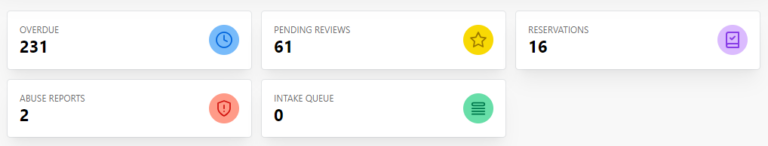 - At-a-glance view of overdue items, pending reviews, reservations, and abuse reports.